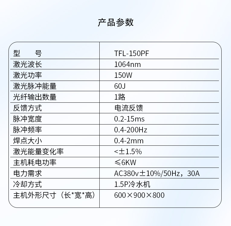 通發(fā)激光TFL-150PF光纖激光焊接機(jī),采用能量反饋控制模式,能量較穩(wěn)定,光纖傳輸光束質(zhì)量好,適合0.5mm以下金屬不銹鋼板材的精密激光焊接,是批量五金產(chǎn)品中小功率焊接專(zhuān)用機(jī)型。