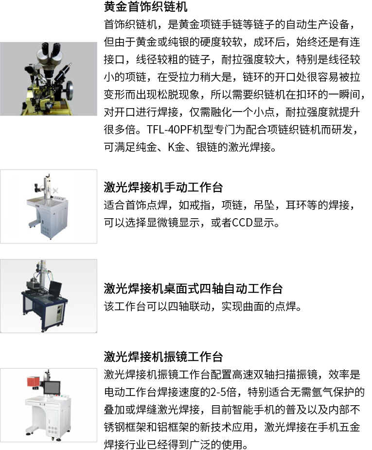 通發(fā)激光研發(fā)針配合黃金織鏈機、K金制鏈機、首飾制鏈機的TFL-80PF自動激光焊接機,焊接機采用能量反饋技術,光點穩(wěn)定,能量強勁,實現(xiàn)一環(huán)一焊的功能,確保金鏈的耐拉強度。本激光焊機實現(xiàn)了水冷一體的小型化結構。適用于各種生產場所。